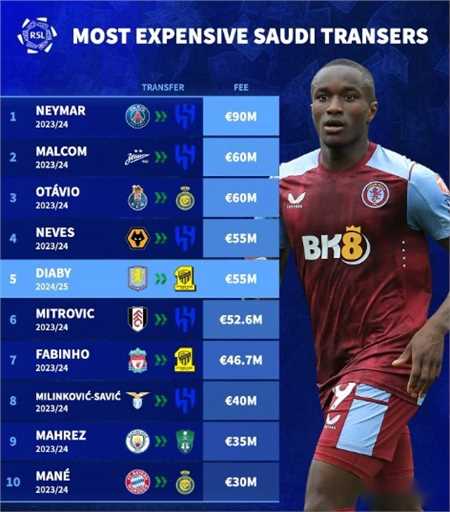随后,德国转会市场在社交媒体上列出了迄今为止沙特最贵的10笔引援,其中内马尔以9000万欧元的转会费居首,穆萨-迪亚比排在第四名。