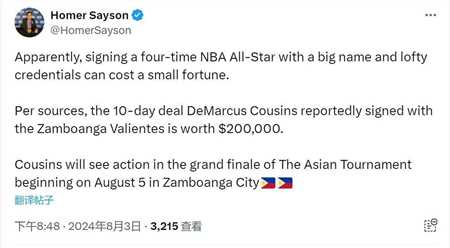 据菲律宾记者homer sayson报道,菲律宾联赛球队三宝颜勇士签下考辛斯,这是一份10天20万美元的短合同。三宝颜勇士签约考辛斯,是为了让他帮球队出战亚洲锦标赛的决赛。作为对比,nba的10天合同大约也是20万美元。