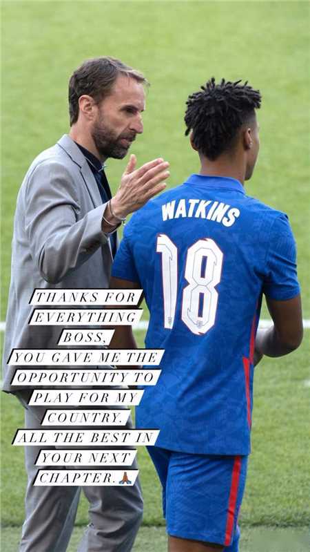 沃特金斯在社交媒体晒出他和索斯盖特的同框照,并写道:“教练,感谢你所做的一切,你给了我代表英格兰队踢球的机会,祝你在下一篇章一切顺利。”
