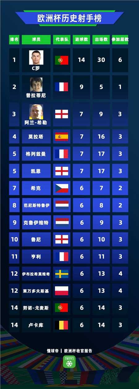 虽然在本届欧洲杯上没有取得进球,但c罗仍然以14粒进球排名欧洲杯历史射手榜榜首,排在第二的普拉蒂尼,排名第三的是阿兰-希勒,排在第四的是西班牙队长莫拉塔,他在本届欧洲杯上打进了西班牙队的首粒进球并最终随队夺冠。在本届欧洲杯打进三球的凯恩排名上升至第五,与格列兹曼并列榜首。