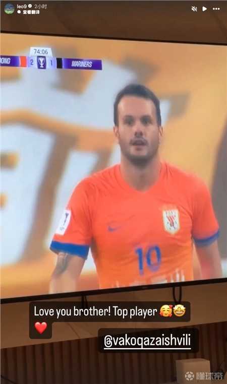 莱昂纳多在社交媒体晒出他在电视机前观看山东泰山亚冠直播的视频,并称赞本场比赛取得进球的前队友卡扎伊什维利,配文:“爱你兄弟!顶级球员。”