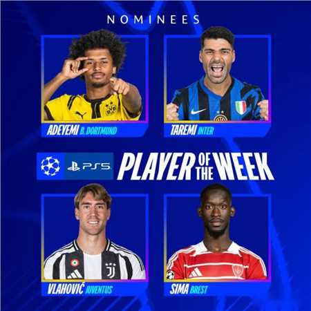 欧冠联赛阶段第2轮18场比赛全部战罢,欧冠官方公布了本周最佳球员候选名单,阿德耶米领衔,弗拉霍维奇、塔雷米、西马在列。