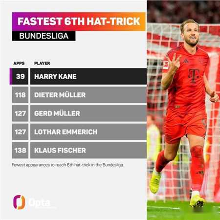 赛后根据统计,这是现年31岁的哈里-凯恩自去年夏天加盟拜仁以来,代表球队出战39场德甲比赛所完成的第6次帽子戏法,这创造了德甲联赛历史完成6次戴帽的最快纪录。