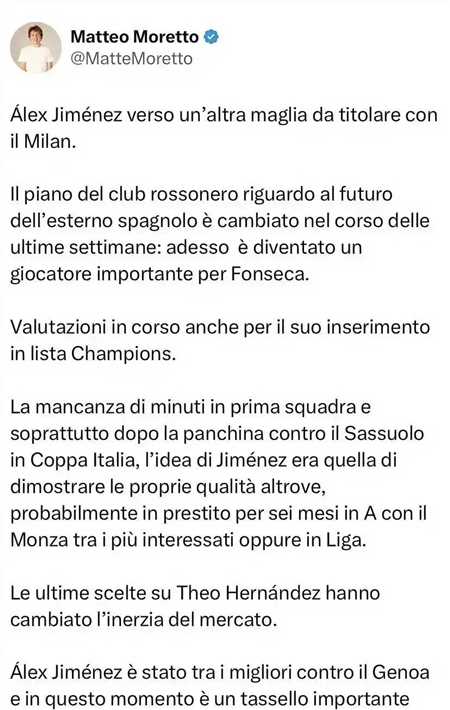 莫雷托消息说特奥的变化改变了米兰对于很多事情的改变,米兰可能会调整自身的市场策略,重新考虑希门尼斯在米兰的定位。米兰与维罗纳之战之前希门尼斯的想法是在其他球队展示自己的能力,当时有消息说希门尼斯可能会租借到意甲联赛球队6个月(蒙扎是最感兴趣的球队之一),或者是西甲联赛。但是特奥的状态问题促使丰塞卡选择了希门尼斯,希门尼斯现在是米兰的重要球员。米兰正在评估把希门尼斯加入到欧冠名单中。